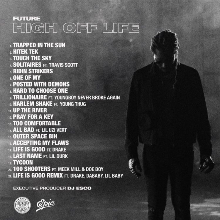 Tracklist "High Off Life" de Future :1/Trapped In The Sun2/Hitek Tek3/Touch The Sky4/Solitaires (feat. Travis Scott)5/Ridin Strikers6/One Of My7/Posted With Demons8/Hard To Choose One9/Trillionaire (feat. YoungBoy Never Broke Again)10/Harlem Shake (feat. Young Thug)11/Up The River12/Pray For A Key13/Too Comfortable14/All Bad (feat. Lil Uzi Vert)15/Outer Space Bih16/Accepting My Flaws17/Life Is Good (feat. Drake)18/Last Name (feat. Lil Durk)19/Tycoon20/100 Shooters (feat. Meek Mill and Doe Boy)21/Life Is Good remix (feat. Drake, DaBaby and Lil Baby)